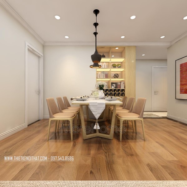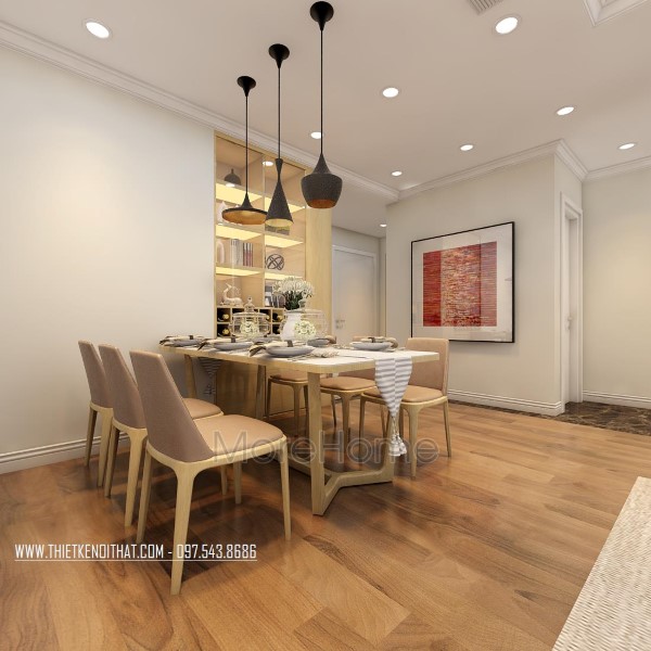 Không gian phòng ăn hiện đại được thiết kế khá giản đơn với bộ bàn ghế big size có công năng sử dụng lớn, kết hợp với đền trang trí đa dạng mẫu mã, kích thước tạo nên một không gian ấm cúng, sang trọng . Ngoài ra, chi tiết trang trí nhẹ nhàng như tranh treo tường sáng tạo giúp không gian trở nên ấn tượng và thu hút hơn rất nhiều.