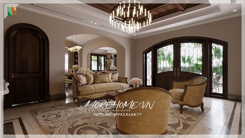 Phòng khách của gia chủ sẽ được trang trí bằng gỗ óc chó cao cấp, cùng với ánh sáng tự nhiên từ cửa kính cường lực ban công 4 cánh lùa, tạo nên một vẻ đẹp sang trọng, hiện đại và tinh tế.